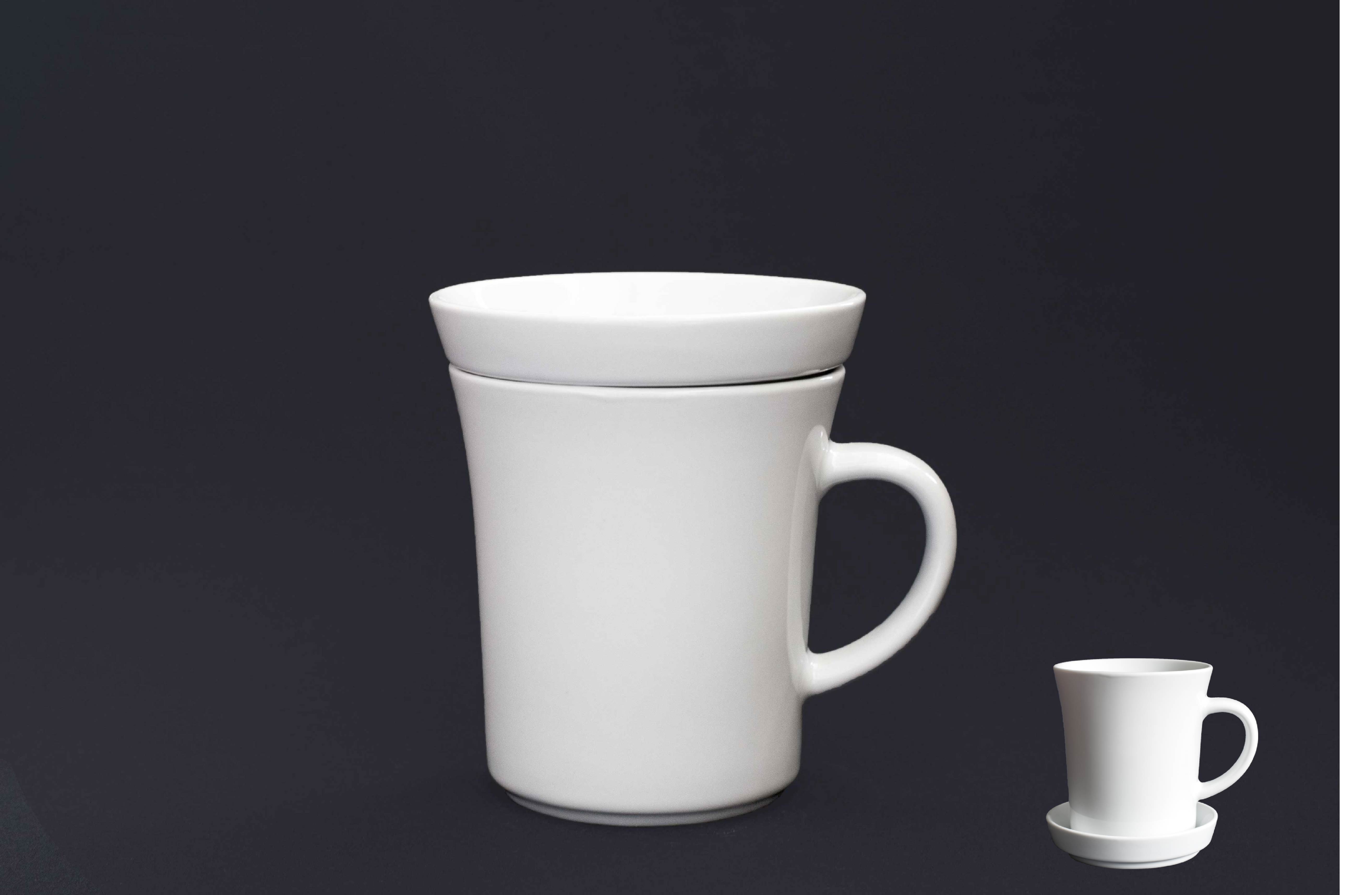 Porcelánový hrnek s praktickým porcelánovým víčkem, které slouží i jako podšálek nebo horní záklopka. Hrnek ideální do gastro provozů anebo jako firemní dárkový předmět s potiskem, pískováním nebo glazurou.